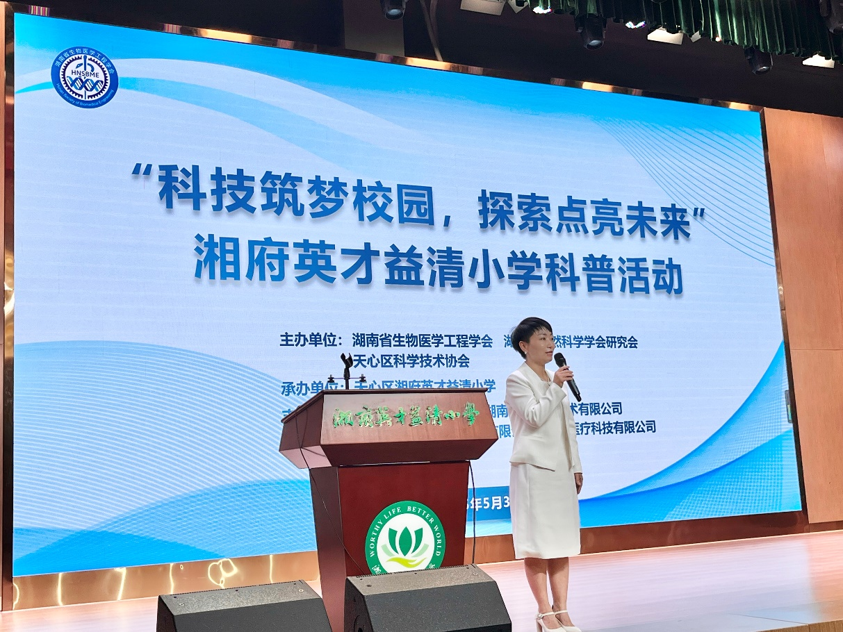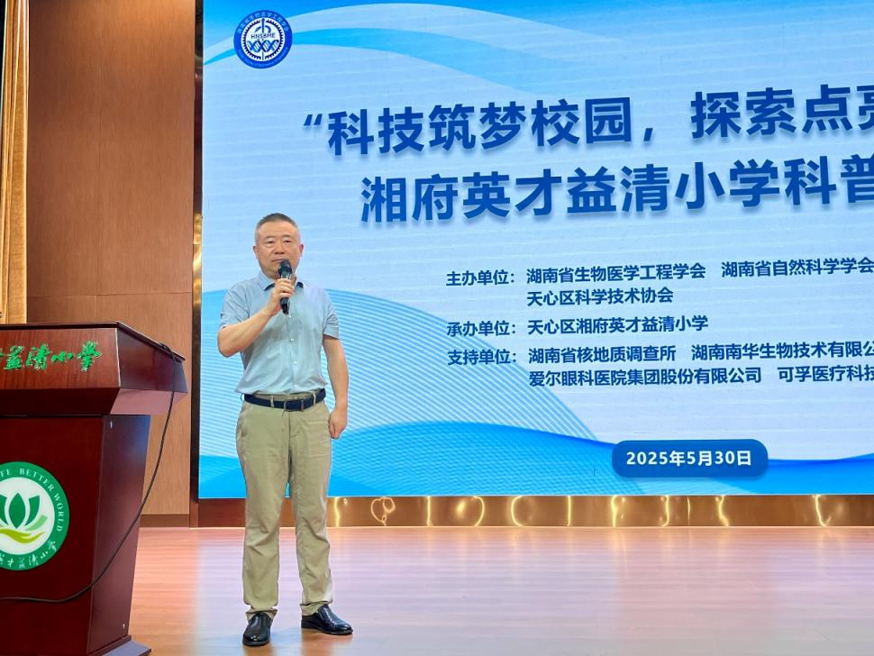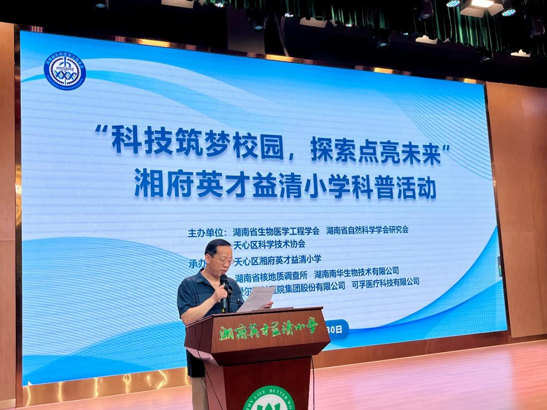 本次活动由湖南省自然科学学会研究会、湖南省生物医学工程学会、天心区科学技术协会主办,湘府英才益清小学承办,得到了湖南省核地质调查所、湖南南华生物技术有限公司、爱尔眼科医院集团股份有限公司、可孚医疗科技有限公司的大力支持,200多人参加。湖南省生物医学工程学会秘书长郑哲主持启动仪式